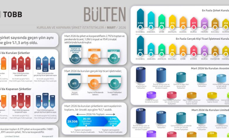 Mart 2026 verileri, bir önceki yılın Mart ayı ile kıyaslandığında; kurulan şirket sayısında önemli bir değişim yaşanmadı. Ancak kurulan kooperatif sayısı yüzde 36,3, gerçek kişi ticari işletme sayısı ise yüzde 4,2 oranında azalış kaydetti.